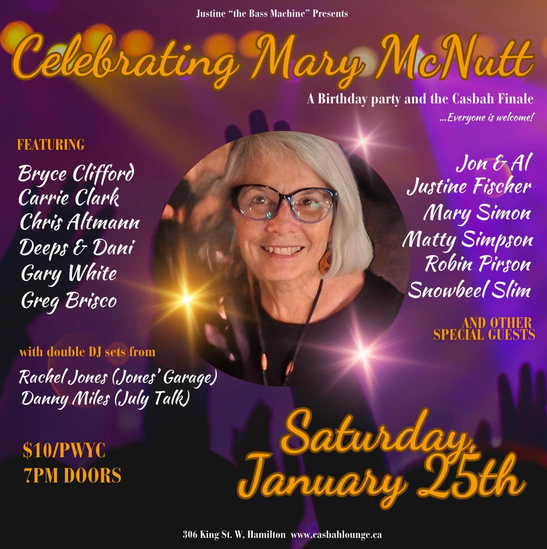 We will be hosting our final show here at the Casbah, and we figured what better way to go out than to celebrate one of the city’s biggest music supporters, Mary McNutt? Even on our slowest nights, we could always count on Mary to show up for the show, even for performers she’d never met. We are hosting a Last Waltz style show with a stellar lineup of Hamilton talent, along with double DJ sets from Rachel Jones and Danny Miles. Come out and celebrate for the love of Hamilton music one last time and cheers to everyone’s biggest fan while you’re at it.